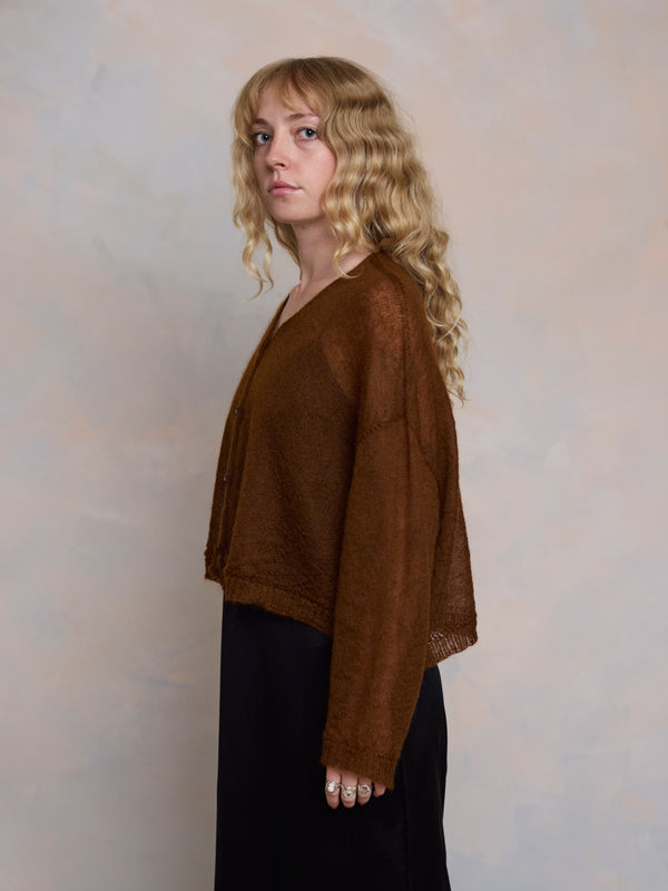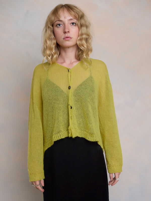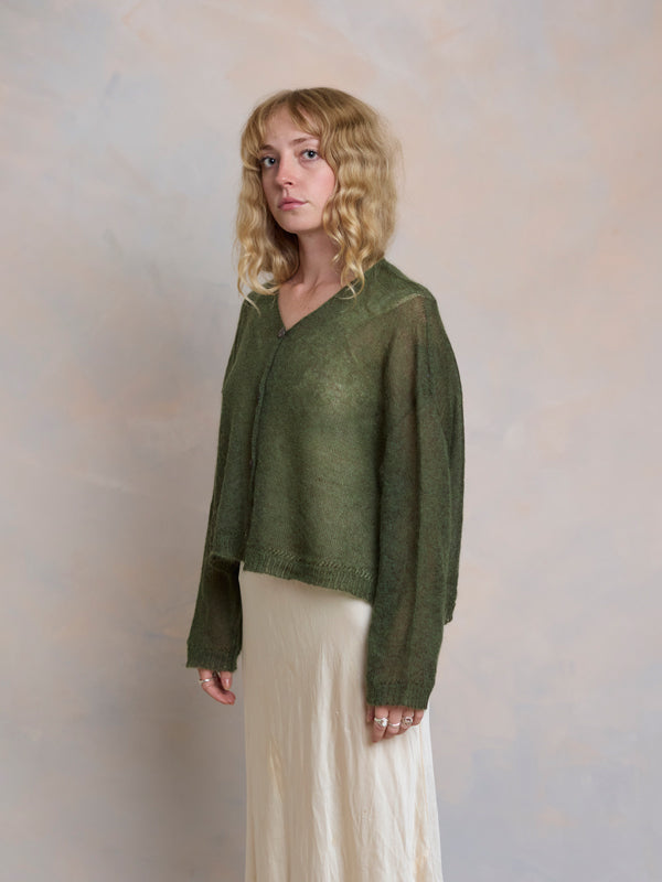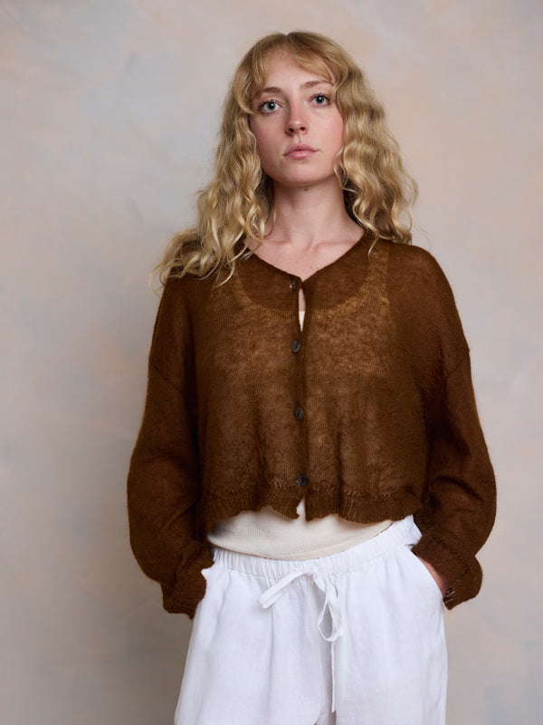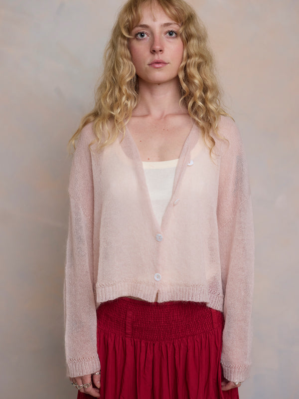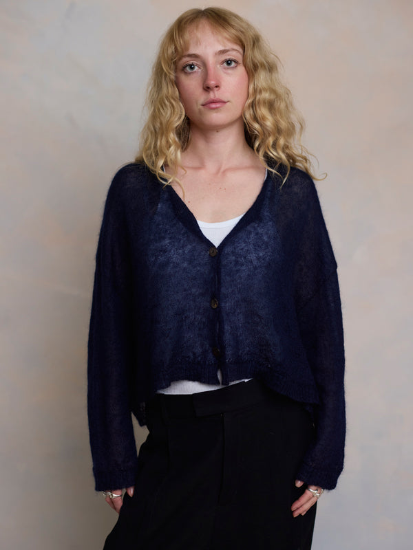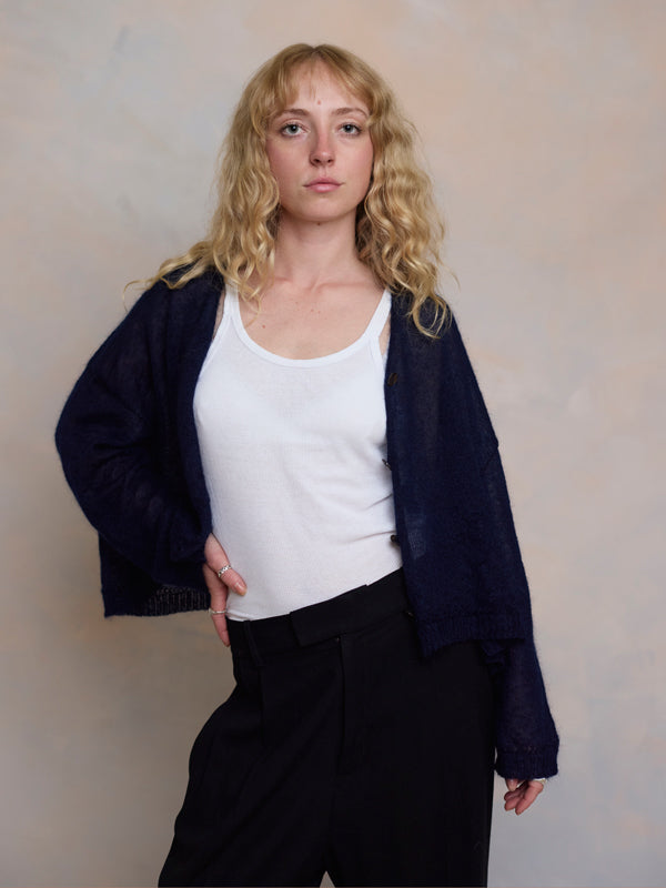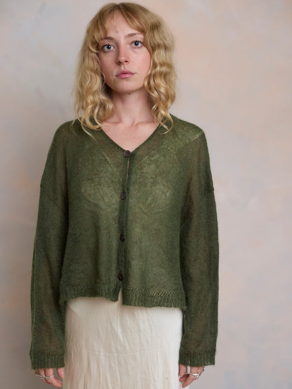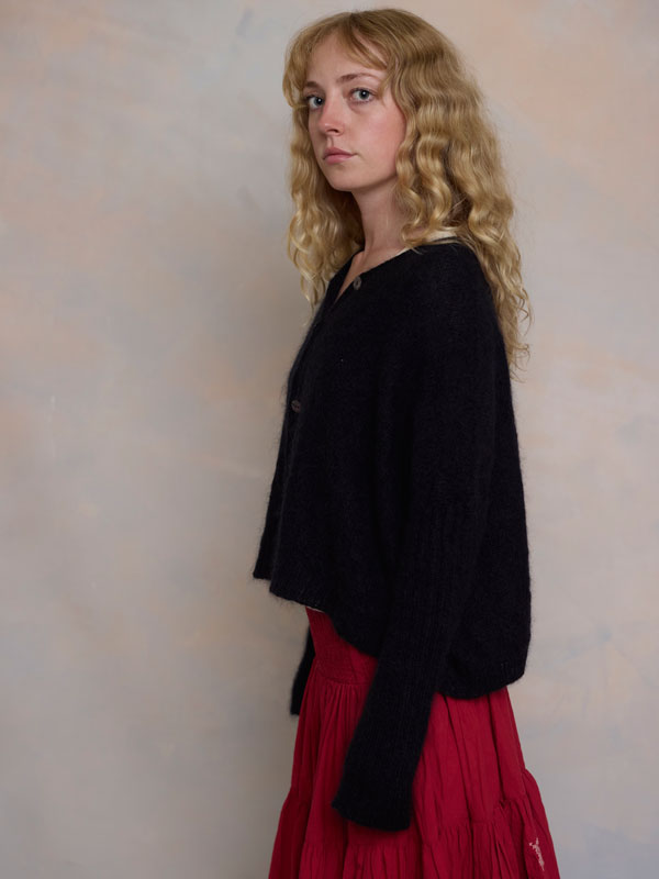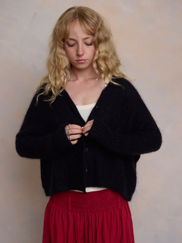 Scrumptiously warm, cute & cosy. Merino & Mohair crop cardigan with subtle diamond pattern through the body to add a little texture. 5 shell buttons...