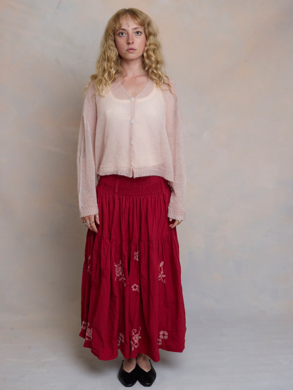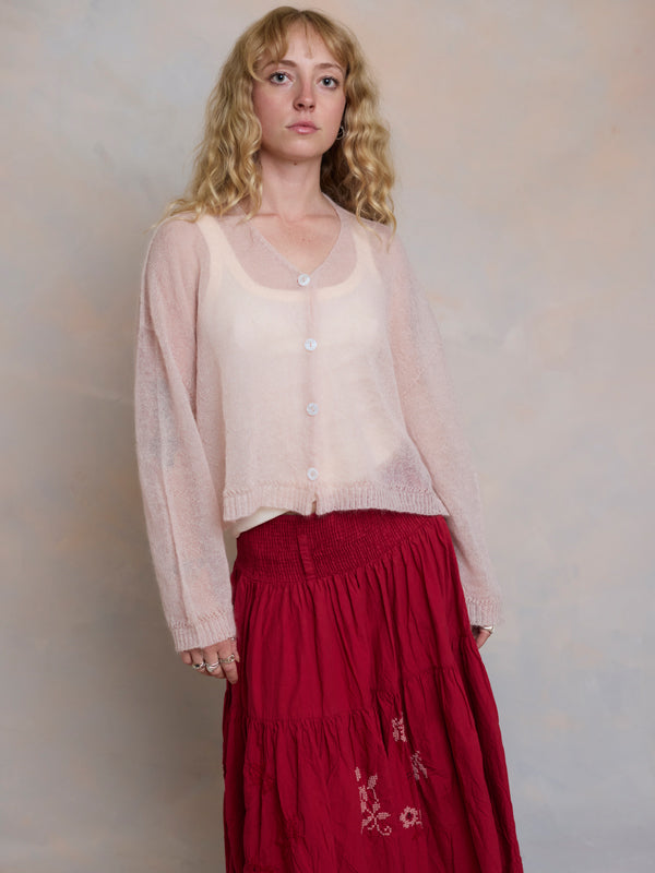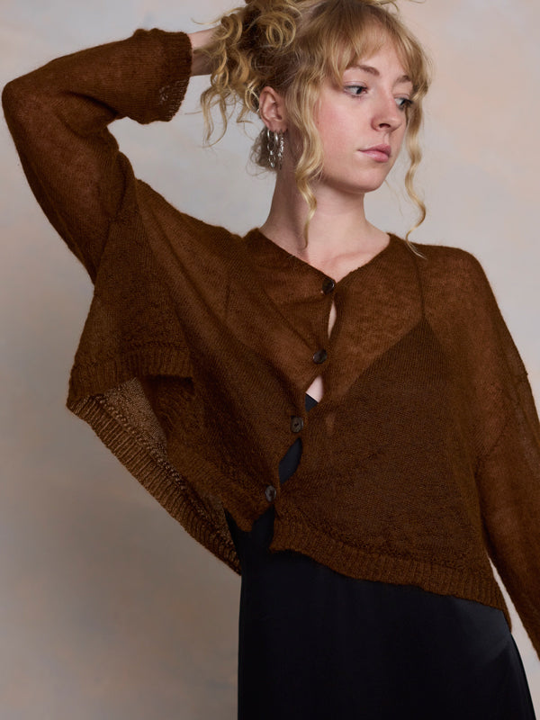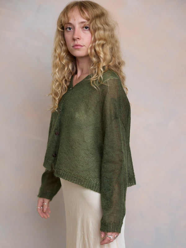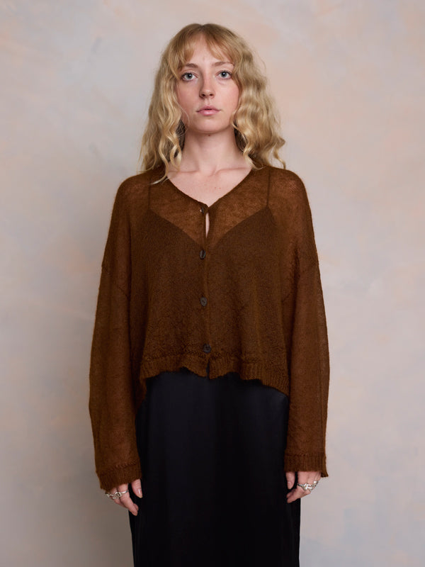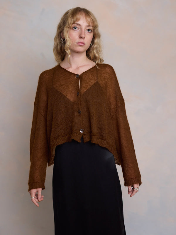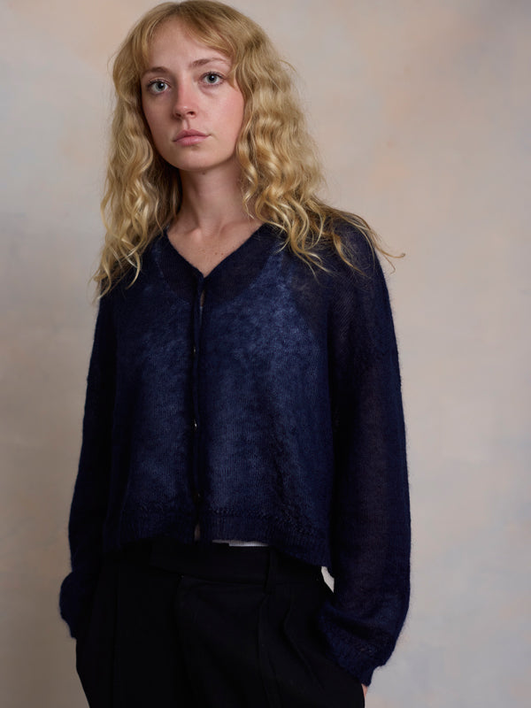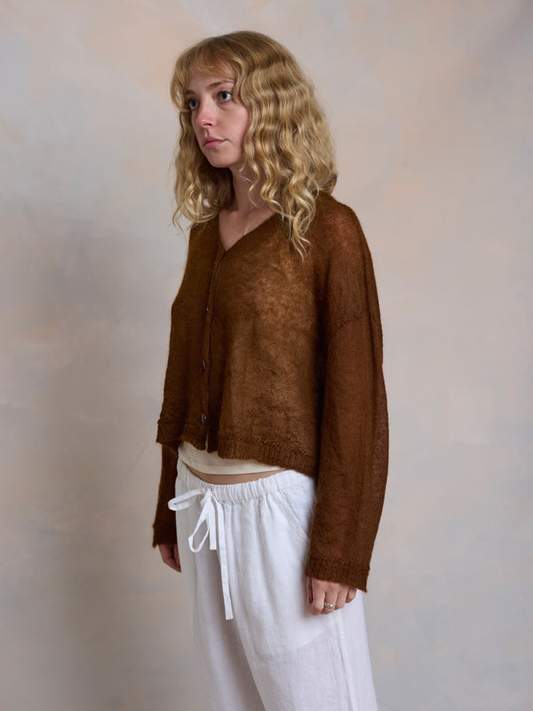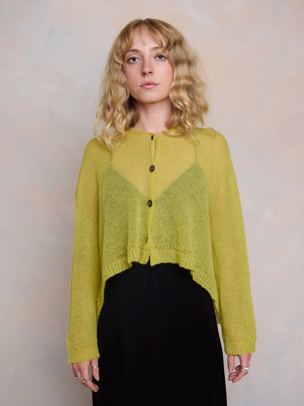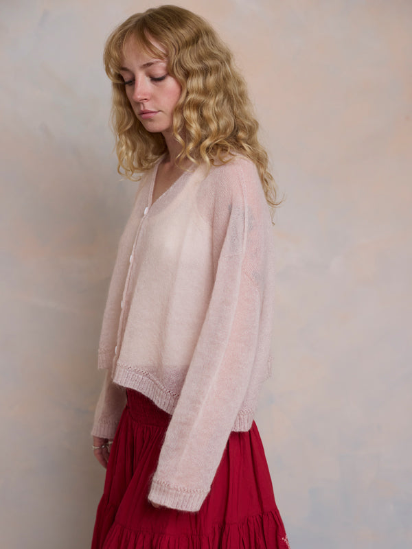 Scrumptiously warm, cute & cosy. Merino & Mohair crop cardigan with subtle diamond pattern through the body to add a little texture. 5 shell buttons...